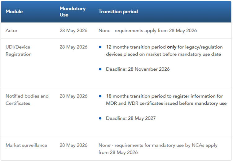 Mandatory use of the four EUDAMED modules for medical devices begins on 28th May 2026. The modules are: